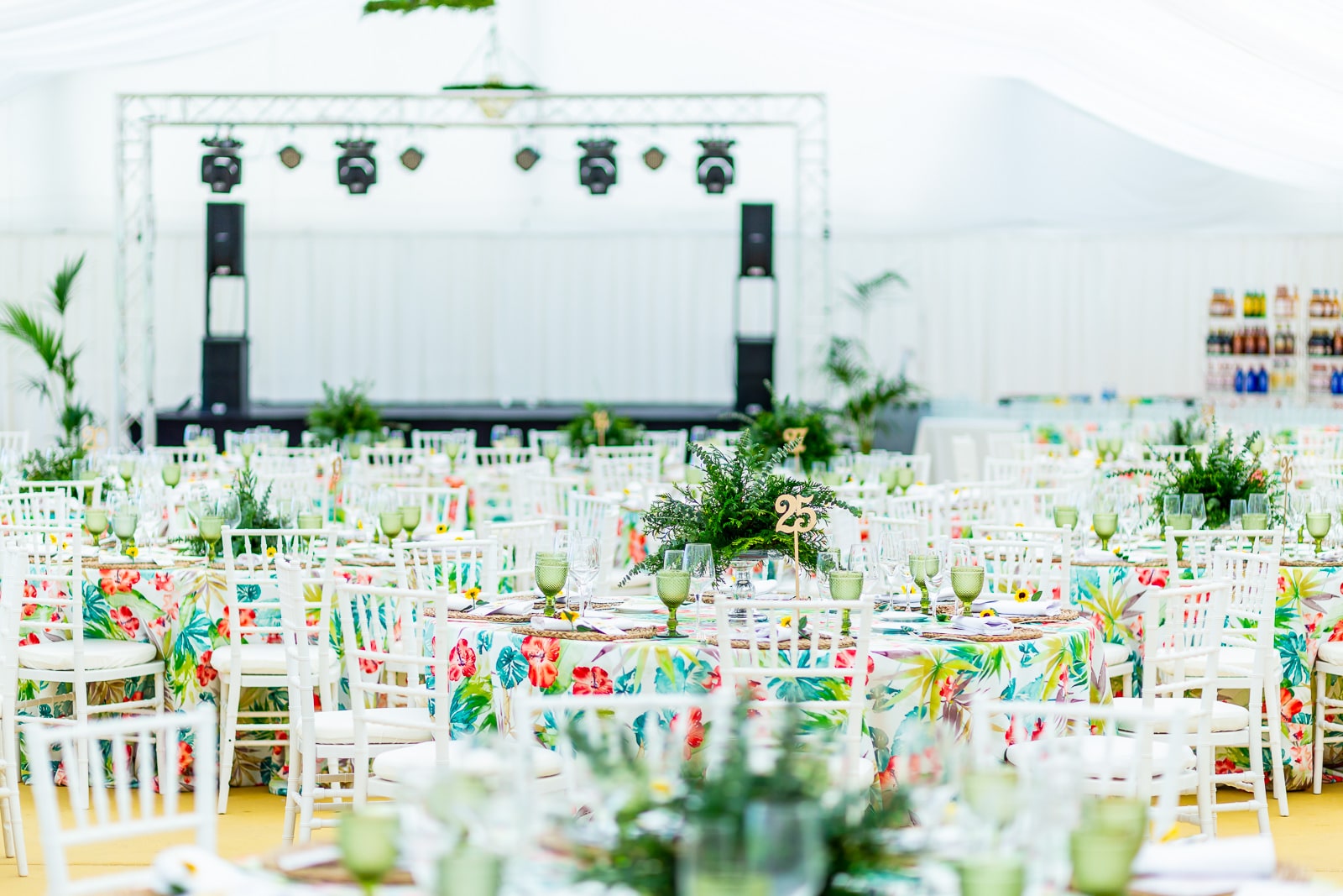 Se realizó un montaje de mesas tipo mixto, con mesas imperiales y redondas, ideal para una boda con tantos comensales. Una mantelería de flores, elemento primaveral por excelencia, a juego de copas labradas en color verde, bajo plato de enea y cubertería en color champán. Los centros de mesas naturales alternados en distintas alturas, formas dispares y con diferentes tipologías de plantas como el eucalipto redondo y la tuya.